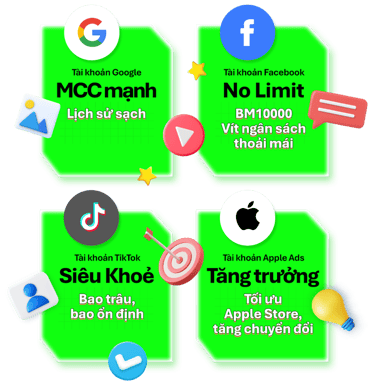 Chúng tôi cung cấp tài khoản doanh nghiệp uy tín, hạn mức cao, trust ổn định, phù hợp để scale ngân sách lớn. Tất cả tài khoản đều có lịch sử chi tiêu sạch, đã được vận hành ổn định và luôn có đội ngũ kỹ thuật bảo hành, hỗ trợ khi cần.